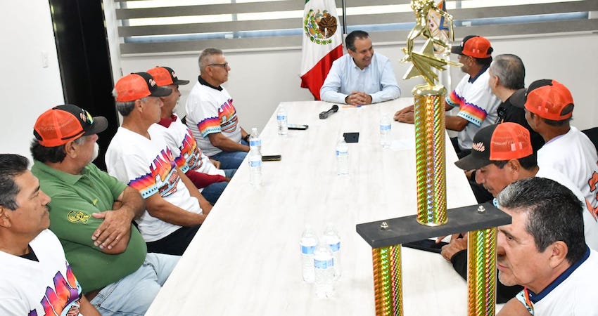 Felicita Toño Astiazarán a beisbolistas veteranos ganadores de campeonato estatal; pertenecen a la Liga Municipal de Beisbol y se preparan para el torneo nacional a efectuarse del 18 al 25 de noviembre próximos en Los Mochis.