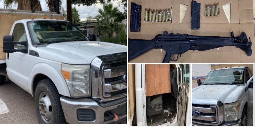 Aseguran armas cartuchos y vehículo con blindaje artesanal en Vícam; la unidad es tipo pick up de carga, de la marca Ford, Super Duty, F350, color blanco.