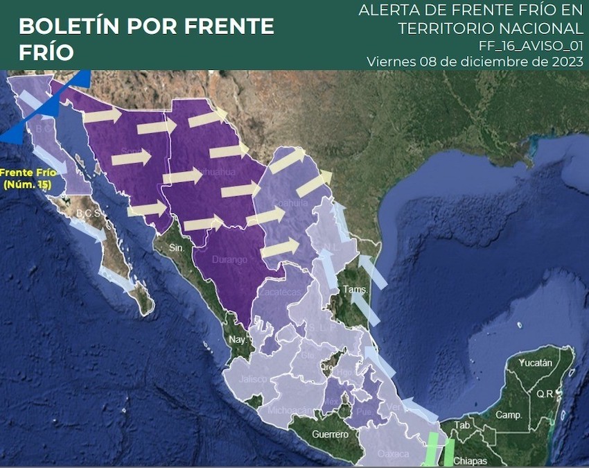 Se ha disipado el frente frío número 15; hay otro frente frío, el número 16, que se aproximará a la frontera norte.