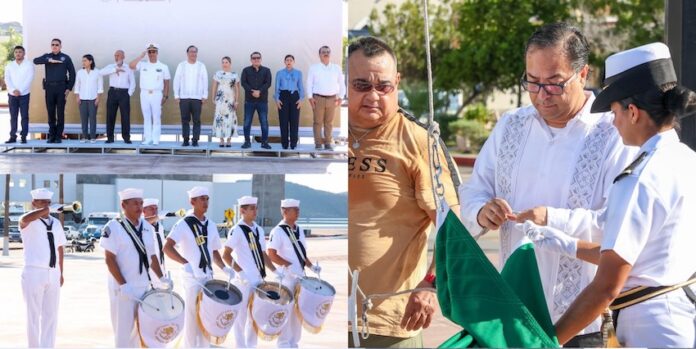 En esta ocasión, el Secretario del Ayuntamiento y el Subinspector de la Segunda Región Naval, Eabani Gaviña Astudillo en representación del Comandante de la Segunda Región Naval, Daniel Escobedo Escobedo, izaron el Lábaro Patrio en la Plaza de los Tres Presidentes ante los invitados.