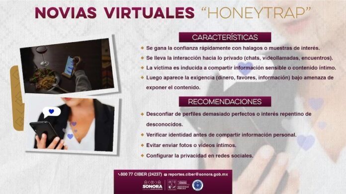 #Hermosillo Alertan por nueva modalidad de extorsión cibernética “Honeytrap”; consiste en engaños románticos, manipulación y seducción en redes sociales o aplicaciones de citas.