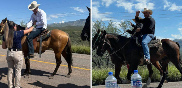 Magdalena de Kino.- Personas a pie y a caballo, acuden a los puntos de hidratación instalados para los peregrinos que viajan a Magdalena de Kino.