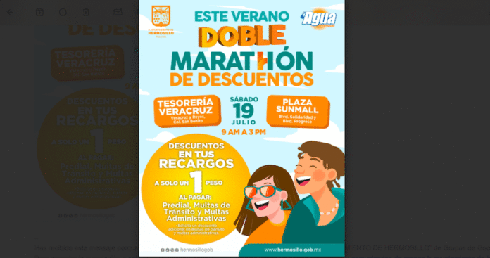 Hermosillo, Sonora.- Estas vacaciones continúa el Ayuntamiento de Hermosillo, a través de Tesorería Municipal y Agua de Hermosillo, dando facilidades a los contribuyentes para ponerse al corriente con sus pagos en el Doble Maratón de Descuentos este sábado 19 de julio.