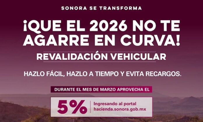 La campaña de revalidación vehicular que dio inicio el pasado 1 de enero está por concluir el próximo martes 31 de marzo, por lo que se invita a realizar el pago por medio del portal oficial: hacienda.sonora.gob.mx con opción de envío a domicilio y aprovechar el 5% de descuento.