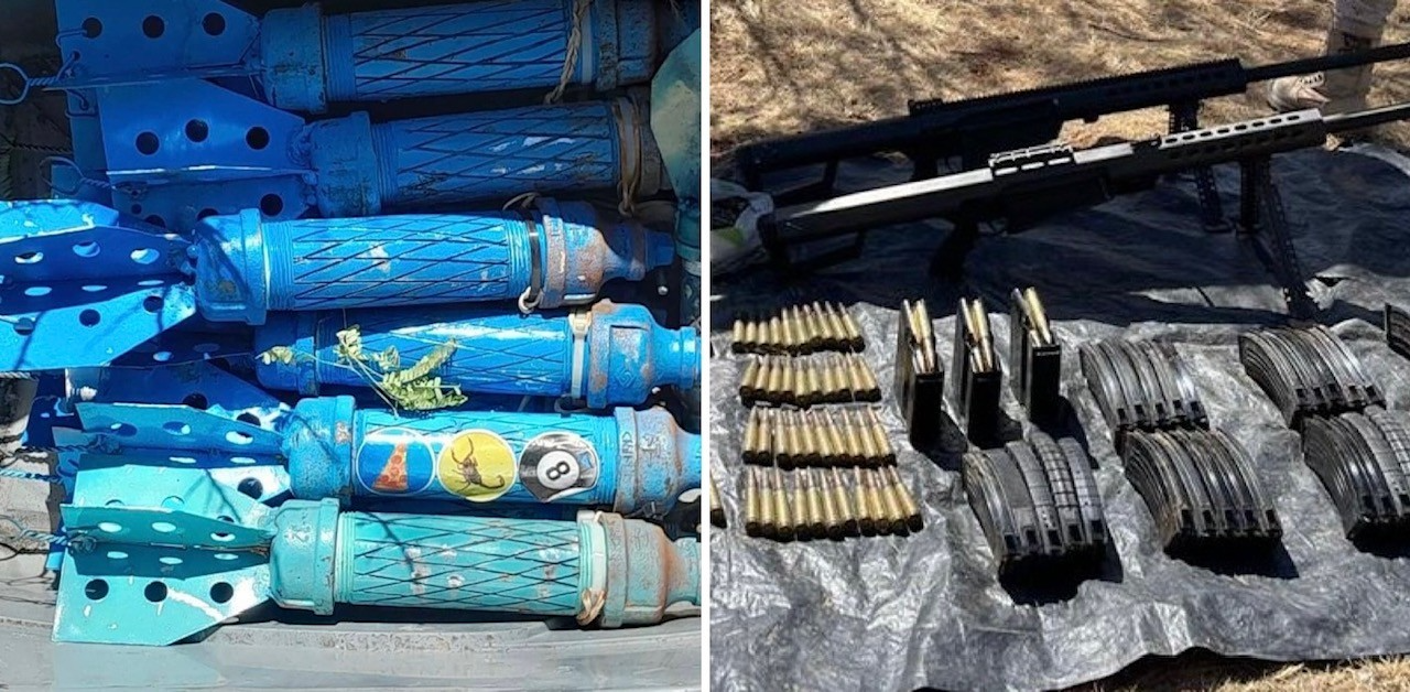 Aseguran artefactos explosivos diseñados para ser lanzados desde un dron; encuentran además fusiles de asalto, cartuchos y cargadores.
