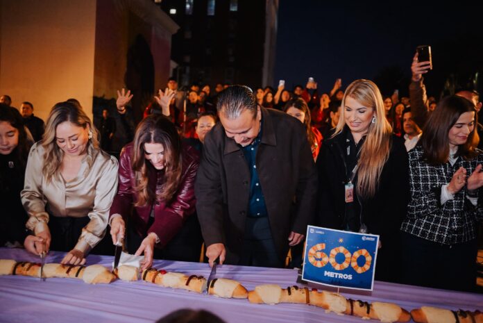 Toño Astiazarán y Patty Ruibal recorrieron la Rosca de Reyes gigante, que fue marcada en intervalos de 50 metros, junto con Karla Fabiola López Bañuelos, directora general de la Universidad Vizcaya de las Américas (UVA), campus Hermosillo; Oscar Gastélum Donnadieu, director de la Agencia Municipal de Desarrollo Económico (AMDE) y Fernanda Cisneros Rodríguez, directora de Desarrollo Económico de la dependencia municipal.