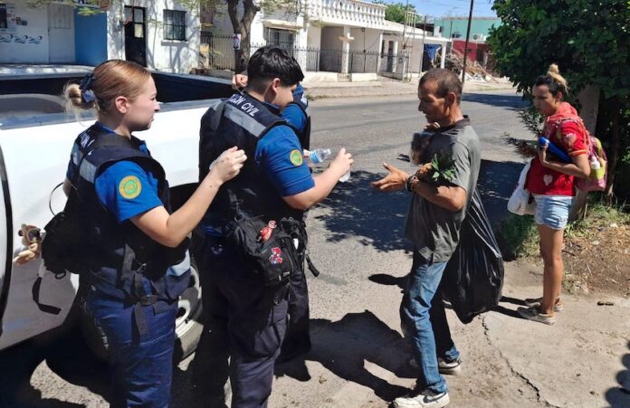 Personal de Protección Civil y de Seguridad Pública Municipal recorrieron diferentes puntos de la ciudad para entregar bebidas hidratantes a personas en la vía pública