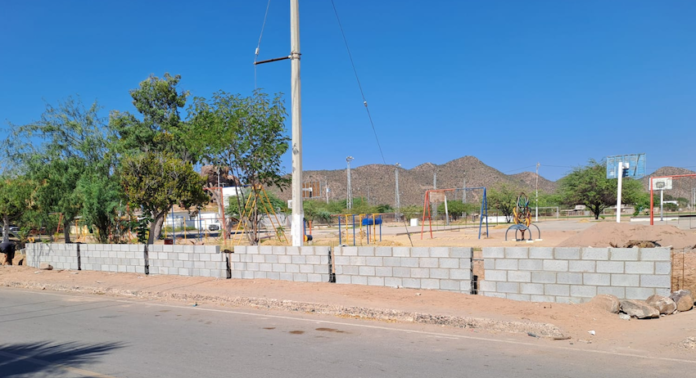 Empalme, Sonora.- Con la construcción de la parte frontal en el complejo deportivo, en la colonia Libertad, el Ayuntamiento, que preside el alcalde Luis Fuentes Aguilar, avanza en los trabajos de rehabilitación del cerco perimetral de la Unidad Deportiva Municipal ‘Ángel Castro’.