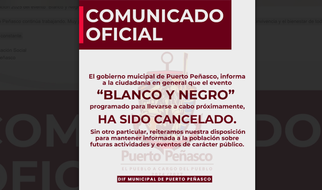#Puerto Peñasco Cancelado Baile Blanco y Negro, en Puerto Peñasco; anuncian habrá nuevos eventos y actividades que promuevan la convivencia y el bienestar de todas las familias.
