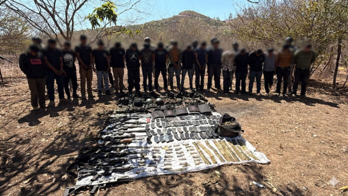 Tepic, Nayarit.- Agentes de la Guardia Nacional en coordinación con personal del Ejército Mexicano y la Policía Estatal de Nayarit, detuvieron a 20 presuntos integrantes de un grupo delictivo, en posesión de armas largas, material bélico y equipo táctico.