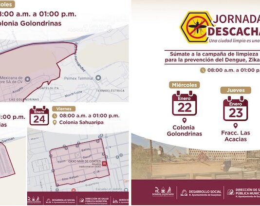 Guaymas, Sonora.- El Ayuntamiento de Guaymas promueve la próxima Jornada de Descacharre a realizarse del 22 al 24 de enero, donde participarán las dependencias de Desarrollo Social, Salud Pública Municipal y Servicios Públicos Municipales.