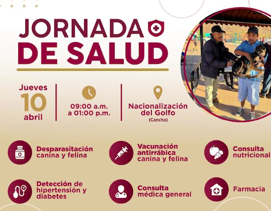 Guaymas, Sonora.- Con servicios enfocados a la prevención de enfermedades, este 10 de abril habrá Jornada de Salud, indicó Austria Castro Gracia. En esta ocasión, personal de Desarrollo Social y Salud Pública Municipal vistarán la colonia Nacionalización del Golfo (cancha) para proporcionar servicios como consulta médica, nutrición, farmacia, detección de...