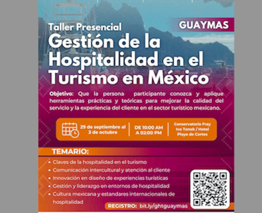 Guaymas, Sonora.- Para promover la capacitación y el fortalecimiento de las actividades turísticas, del 29 de septiembre al 3 de octubre se realizará el taller presencial “Gestión de la hospitalidad en el turismo en México” organizado por el Gobierno del Estado a través de la Secretaría de Economía y...