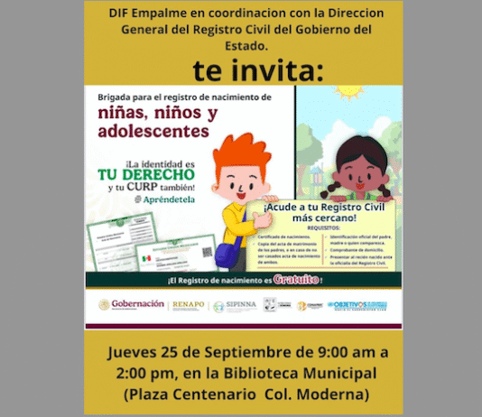 Empalme, Sonora.- En coordinación con la Dirección General del Registro Civil en Sonora, el Sistema Municipal para el Desarrollo Integral de la Familia (DIF) Empalme, llevará a cabo una brigada especial para el registro de nacimientos de niñas, niños y adolescentes, este jueves 25 de septiembre.