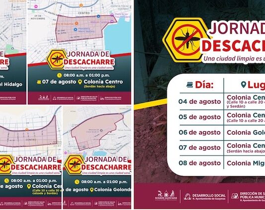 Guaymas, Sonora.- Del 04 al 08 de agosto, el Ayuntamiento de Guaymas a través de Desarrollo Social, Salud Pública Municipal y Servicios Públicos tendrá Jornada de Descacharre en el sector Centro, las Golondrinas y Miguel Hidalgo, esto como parte del compromiso de la doctora Karla Córdova de trabajar en...