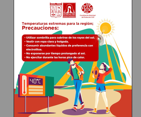 🚨☀️ Ante las altas temperaturas que se registran en la región, el Ayuntamiento de Empalme, a través de la Coordinación Municipal de Protección Civil y Municipal de Salud, exhorta a la ciudadanía a seguir estas recomendaciones para prevenir afectaciones a la salud. ⚠️ En caso de presentar síntomas de deshidratación...