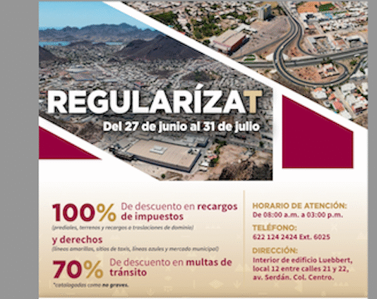 Guaymas, Sonora.- Del 27 de junio al 31 de julio el Ayuntamiento de Guaymas a través de Tesorería Municipal activa el programa “RegularízaT”. Obtén un 100 por ciento de descuento en recargos de impuestos (prediales, terrenos y recargos a traslaciones de dominio) y derechos (Líneas amarillas, sitios de taxis, líneas...