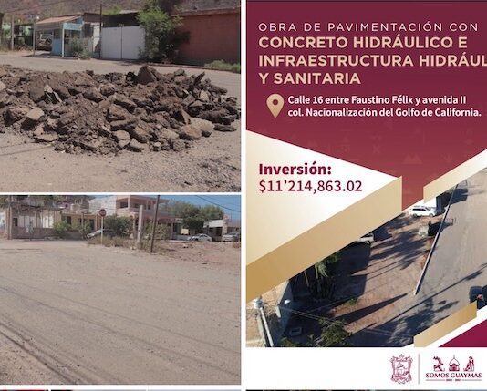 Guaymas, Sonora.- Para el beneficio de familias y habitantes que transitan por el lugar, inició el Ayuntamiento de Guaymas la obra de pavimentación con concreto hidráulico e infraestructura hidráulica y sanitaria en calle 16 entre Faustino Félix y avenida II del sector Nacionalización Golfo de California.