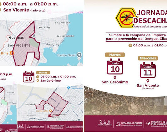 Guaymas, Sonora.- A participar en la próxima jornada de descacharre invita el Ayuntamiento de Guaymas a vecinos de las colonias San Gerónimo y San Vicente (lado este y oeste), y de esta manera se prevengan casos de dengue, zika y chikungunya en la comunidad, indicó la directora de Salud...