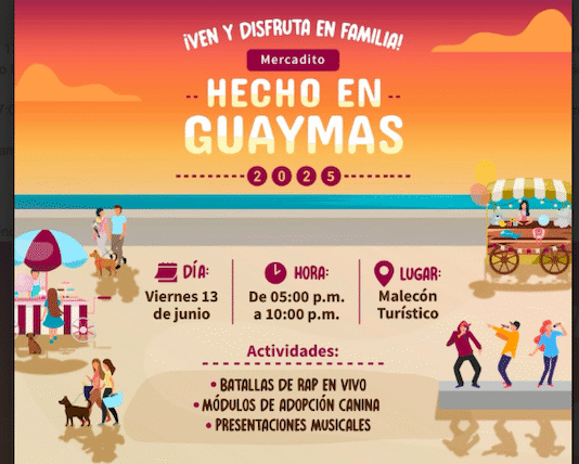 Guaymas, Sonora.- Te esperamos este 13 de junio en el Mercadito Hecho en Guaymas que organiza en el Malecón Turístico el Ayuntamiento de Guaymas y el Instituto Sonorense de la Juventud a través de Desarrollo Económico y Turístico, Desarrollo Social, la Coordinación de Atención a la Mujer, la Coordinación...