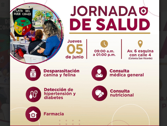 Guaymas, Sonora.- Con servicios como desparasitación canina y felina, consulta médica general, detección de hipertensión y diabetes, farmacia y consulta nutricional, este jueves 05 el Ayuntamiento de Guaymas a través de Desarrollo Social y Salud Pública Municipal tendrá Jornada de Salud. Esta jornada será en la av. 6 esquina con...