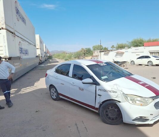 Empalme, Sonora.- Un automóvil del servicio de alquiler fue impactado esta tarde por un tren carguero en el crucero del bulevar Hilario Sánchez Rubio, de la colonia Bellavista, por rumbo del llamado ‘Segurito’. La unidad del servicio público es de la marca Chevrolet, tipo sedán, de la línea Aveo, en...