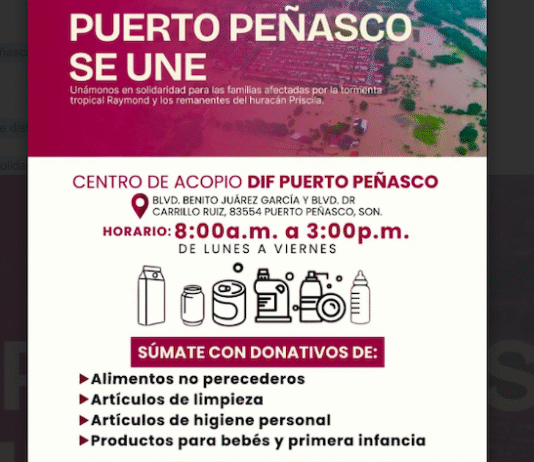 Puerto Peñasco.- En solidaridad con las familias afectadas por la tormenta tropical Raymond y los remanentes del huracán Priscila, el Gobierno de Puerto Peñasco, a través del Sistema DIF Municipal, se une a la colecta estatal impulsada por DIF Sonora. Invitamos a la comunidad rocaportense a sumarse con donativos de: ...