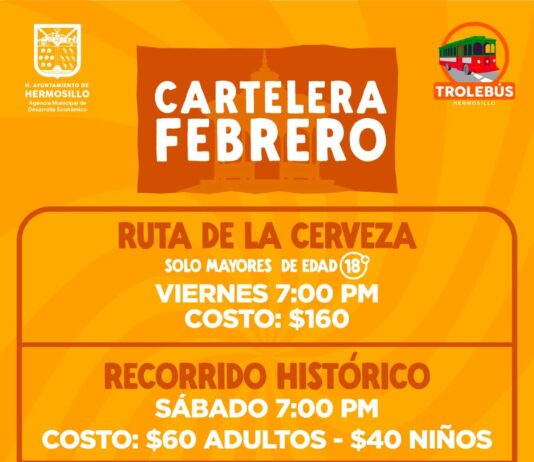 Hermosillo, Sonora.- La Dirección de Desarrollo Turístico de la Agencia Municipal de Desarrollo Económico del Ayuntamiento de Hermosillo, invita a la ciudadanía a disfrutar de la Cartelera de Febrero del Trolebús, que ofrece recorridos turísticos y experiencias culturales para residentes y visitantes. Como parte de esta programación, se llevará a cabo...