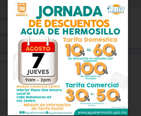 Hermosillo, Sonora.- Agua de Hermosillo invita a sus usuarios a participar en la Jornada de Descuentos que se llevará a cabo el jueves 7 de agosto, en el Módulo Centro, ubicado en la Plaza Cine Sonora, local 10, en Calle Matamoros 169, colonia Centro, en un horario de 9:00...