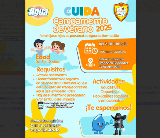 Hermosillo, Sonora.- Con el objetivo de brindar a las hijas e hijos del personal de Agua de Hermosillo un verano lleno de aprendizaje, diversión y valores, Agua de Hermosillo, en conjunto con el Sindicato de Trabajadores de Agua de Hermosillo-CTM, anuncia la realización del Campamento de Verano CUIDA 2025. Este...