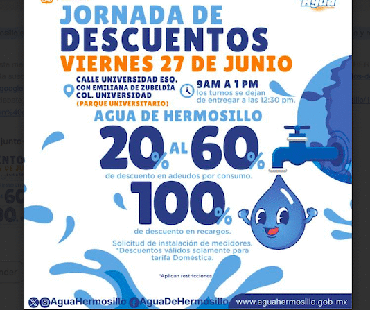 Hermosillo, Sonora.- Agua de Hermosillo invita a los usuarios del servicio a aprovechar su próxima jornada de descuentos, que se llevará a cabo este viernes 27 de junio en la colonia Universidad. Durante esta jornada, los usuarios con adeudos podrán acceder a descuentos que van del 20% al 60% en...