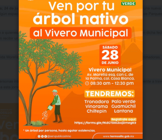 Hermosillo, Sonora.- El próximo sábado 28 de junio las y los hermosillenses tendrán una nueva oportunidad de recibir gratuitamente árboles nativos que podrán plantar en algún espacio público o privado de su preferencia, anunció Amparo Fontanot, directora de Parques y Jardines del Ayuntamiento de Hermosillo. La funcionaria invitó a quienes tengan...