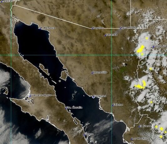 Hermosillo, Sonora.- En imagen satelital se muestra el desarrollo de nubosidad vertical sobre la región del oriente, se prevé que durante las próximas horas se aumente el potencial de tormentas sobre la zona serrana de Sonora. Esto podría dejar lluvias puntuales sobre municipios de la región serrana y sur del...