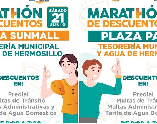 Hermosillo, Sonora.- Con promociones en descuentos y recargos de Tesorería Municipal y Agua de Hermosillo, este sábado 21 de junio se realizará la decimosegunda edición del “Marathón de Descuentos” que realiza el Ayuntamiento de Hermosillo. Yazmina Anaya Camargo, directora de Ingresos de Tesorería Municipal, manifestó que en horario de 9:00...