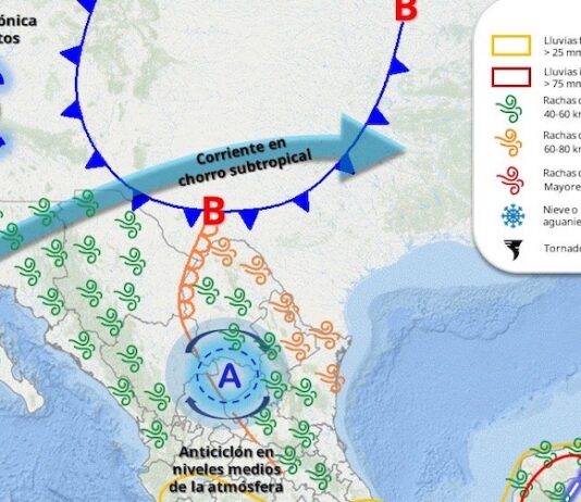 Ciudad de México.- Persiste un 80% de probabilidad para que se forme una zona de Baja Presión con potencial ciclónico en los siguientes 7 días, al sur del Pacífico mexicano. Sistema que esta mañana se ubica a 515 kilómetros al sur-sureste de Salina Cruz, Oaxaca, con probabilidad de desarrollo ciclónico...