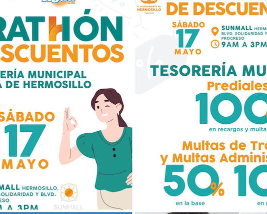 Hermosillo, Sonora.- Residentes del norte de la ciudad podrán aprovechar los beneficios del “Marathón de Descuentos” del Ayuntamiento de Hermosillo este sábado 17 de mayo en SUNMALL ubicado en los cruces de los bulevares Solidaridad y Progreso de 9:00 am a 3:00 pm. A través del módulo itinerante personas contribuyentes...