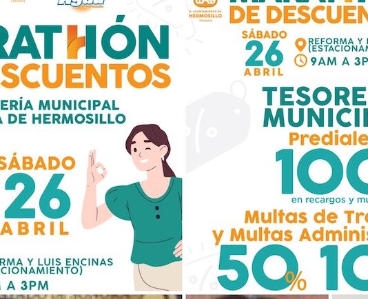 Hermosillo, Sonora.- Contribuyentes que deseen estar al corriente podrán aprovechar este sábado 26 de abril el Maratón de Descuentos que Tesorería Municipal organiza en el estacionamiento ubicado en Luis Encinas y Reforma de 9:00 am a 3:00 pm. Yazmina Anaya Camargo, directora de Ingresos de la dependencia del Ayuntamiento de...