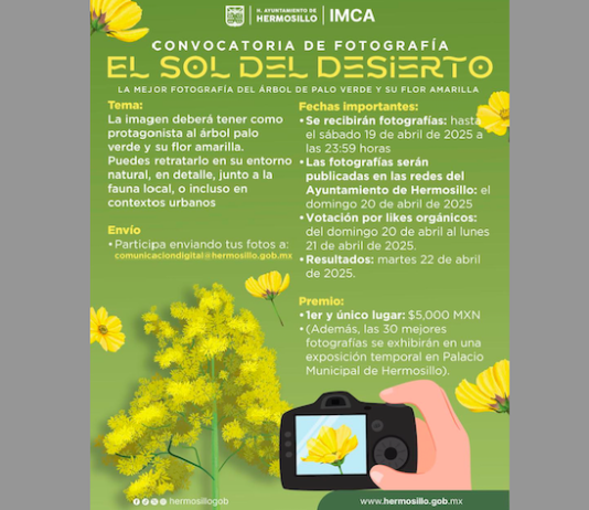 Hermosillo, Sonora.- Las y los hermosillenses pueden plasmar en una fotografía la belleza de la flora desértica y ganar un premio económico en la convocatoria de fotografía “El Sol del Desierto”, informó Marianna González Gastélum, Directora General del Instituto Municipal de Cultura y Arte, IMCA. La titular del IMCA manifestó que...