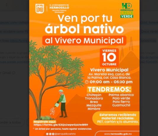 Hermosillo, Sonora.- El Ayuntamiento de Hermosillo, a través de Servicios Públicos Municipales, invita a la ciudadanía a participar en la jornada de entrega de árboles nativos que se llevará a cabo este viernes 10 de octubre. La cita es en el Vivero Municipal, ubicado en avenida Morelia esquina con calle de...