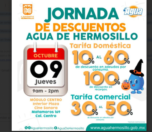 Hermosillo, Sonora.- Agua de Hermosillo convoca a sus usuarios a participar en la Jornada de Descuentos que se llevará a cabo el jueves 09 de octubre, en el Módulo Centro Interior Plaza Cine Sonora, en un horario de 9:00 a.m. a 2:00 p.m.