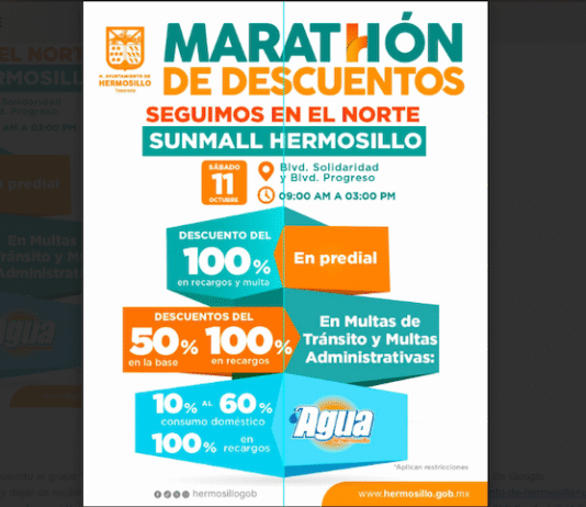 Hermosillo, Sonora.- El Gobierno Municipal de Hermosillo realizará el próximo sábado 11 de octubre un nuevo “Maratón de Descuentos” en la plaza comercial Sun Mall, de las 9:00 a las 15:00 horas, informó Yazmina Anaya Camargo. La Directora de Ingresos de Tesorería Municipal explicó que este ese día las y...