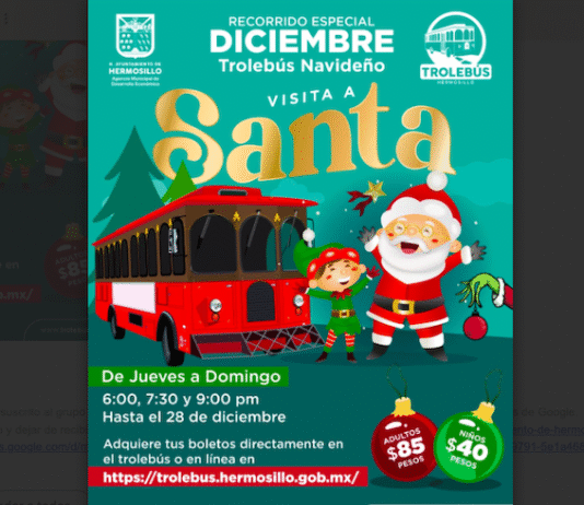 Hermosillo, Sonora.- El Ayuntamiento de Hermosillo, por medio de la Dirección de Desarrollo Turístico, invita a las familias hermosillenses a disfrutar del Trolebús Navideño, un recorrido especial que ofrece un ambiente navideño y la oportunidad de visitar la Casa de Santa Claus del jueves 4 hasta el 28 de...