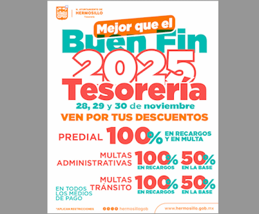 Hermosillo, Sonora.- La última promoción del año “Mejor que el Buen Fin 2025” lanzará Tesorería Municipal los días 28, 29 y 30 de noviembre donde las y los contribuyentes podrán ponerse al corriente con sus pagos. Yazmina Anaya Camargo, directora de Ingresos de Tesorería Municipal informó que los descuentos van...