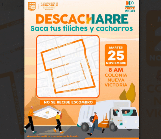 Hermosillo, Sonora.- Este martes 25 de noviembre, personal de Servicios Públicos Municipales y de la Dirección de Salud Municipal acercará a la colonia Nueva Victoria una jornada de descacharre intensiva. Las actividades se realizarán a partir de las 8:00 horas en el polígono previamente marcado en las calles Sierra Madre...