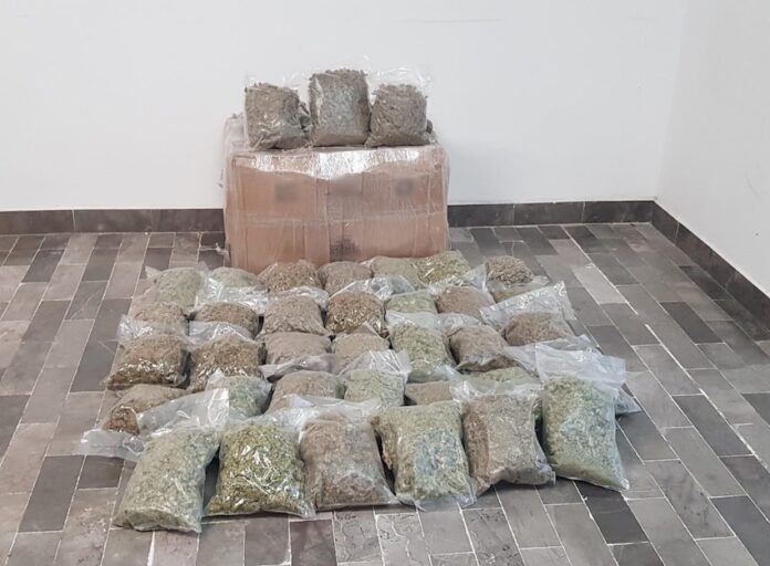 El personal de la Guardia Nacional inspeccionó la caja de cartón y localizó 40 paquetes de plástico cerrados al alto vacío, que contenían hierba verde y seca con las características propias de la marihuana.