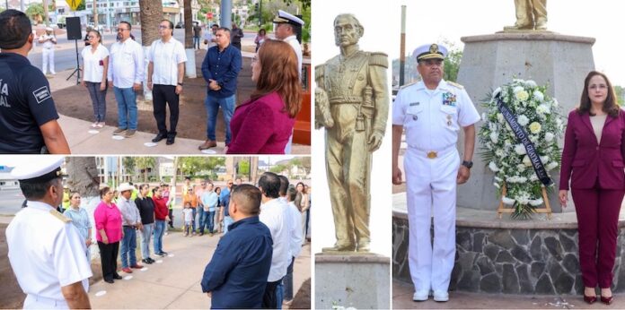 Encabezando esta ceremonia la doctora Karla Córdova González acompañada por Daniel Escobedo Escobedo, Comandante de la Segunda Región Naval, colocaron una ofrenda para después efectuar una guardia de honor.