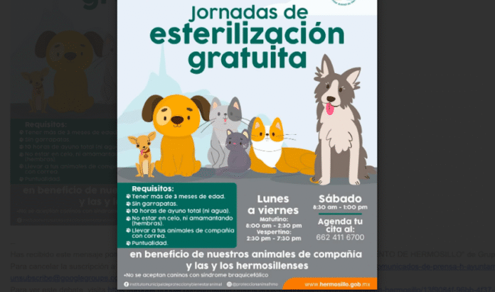 Hermosillo, Sonora.- Todas las personas tutoras o guardianes de perros y gatos pueden aprovechar el servicio de esterilizaciones gratuitas que ofrece permanentemente el Instituto Municipal de Protección y Bienestar Animal (IMPBA), que en la semana del 12 al 18 de mayo estarán en varias colonias de la ciudad, así como en Bahía de Kino y en el ejido La Victoria.