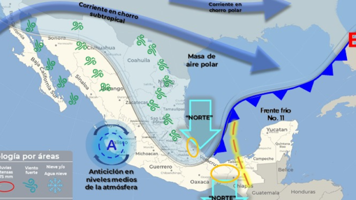 Durante hoy la masa de aire asociada al frente en interacción con la corriente en chorro subtropical continuará ocasionando cielos parcialmente nublados y un ambiente frio durante la madrugada y noche con temperaturas mínimas desde los -5°C a 5°C en regiones altas montañosas del noreste y oriente, de 0°C a 5°C sobre el norte; de 5°C a 15°C sobre el centro y de 10°C a 15°C sobre el sur del estado. Así mismo, se prevén rachas de viento de 40 kph sobre el oriente del estado.