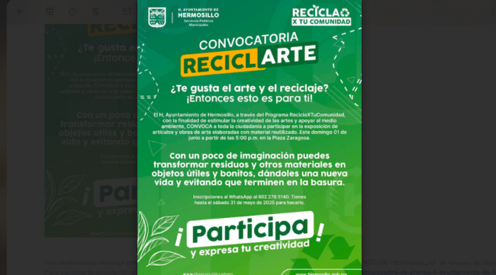 Hermosillo, Sonora.- Las personas que gustan del arte y el reciclaje tienen oportunidad de desplegar su creatividad respondiendo a la convocatoria “Reciclarte” que lanzó el Ayuntamiento de Hermosillo a través de Servicios Públicos Municipales.