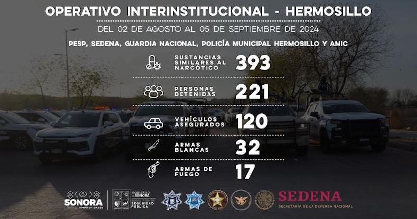 Inicio Detiene operativo coordinado a 221 personas en acciones de seguridad en HMO #HERMOSILLO Detiene operativo coordinado a 221 personas en acciones de seguridad en HMO; desde al día 2 de agosto a la fecha, incautaron 17 armas de fuego, 32 armas blancas, alrededor de 100 vehículos.